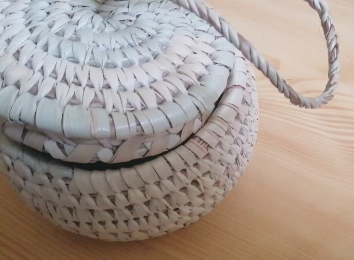 Un joli petit panier avec couvercle ont fabriqués par des regroupements féminins au Bénin qui utilisent des feuilles de jacynthe d'eau séchées.